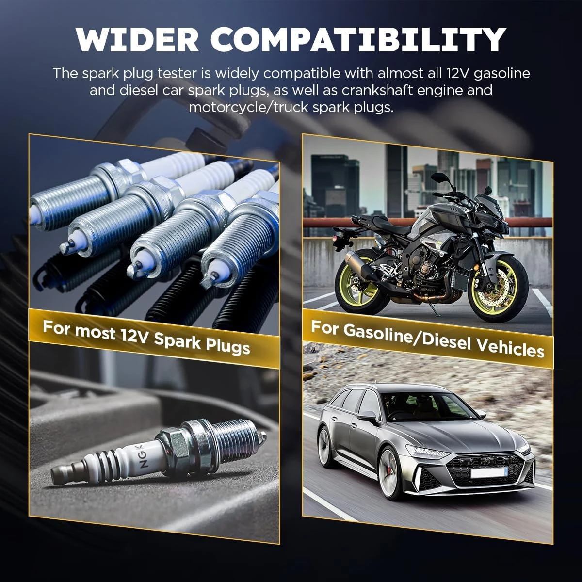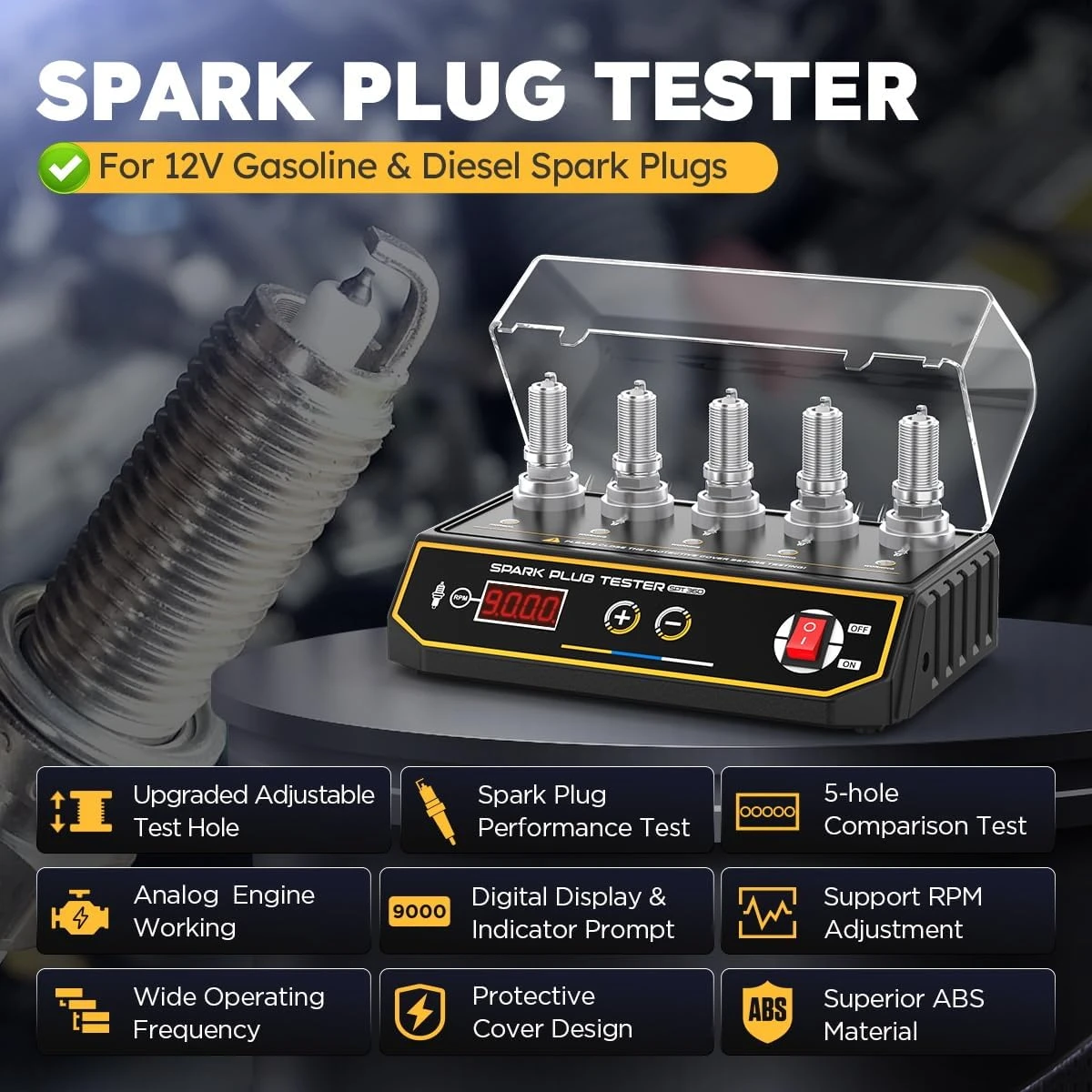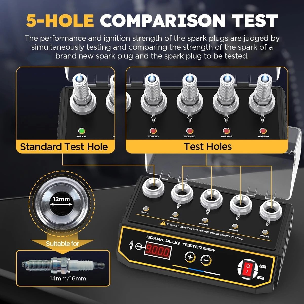 5 فتحات قابلة للاختبار معًا: اختبار 5 شمعات إشعال بشكل متزامن، مما يزيد من سرعة التشخيص والكشف عن الشمعة الضعيفة فورًا، مع إمكانية مقارنة قوة الشرارة ودرجة الاحتراق بين الشمعات الجديدة والمستعملة وتحديد مدى تآكل شمعة الإشعال من لون الشرارة.