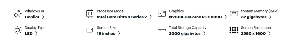 المعالج: Intel Core Ultra 9 Series 2 (275HX) بمعمارية متقدمة، 24 نواة (8 أداء و16 كفاءة)، تردد أساسي 2.7 جيجاهرتز مع تعزيز حتى 5.1 جيجاهرتز، مع وحدة معالجة عصبية (NPU) لتحسين مهام الذكاء الاصطناعي بسرعة 13 تريليون عملية بالثانية.