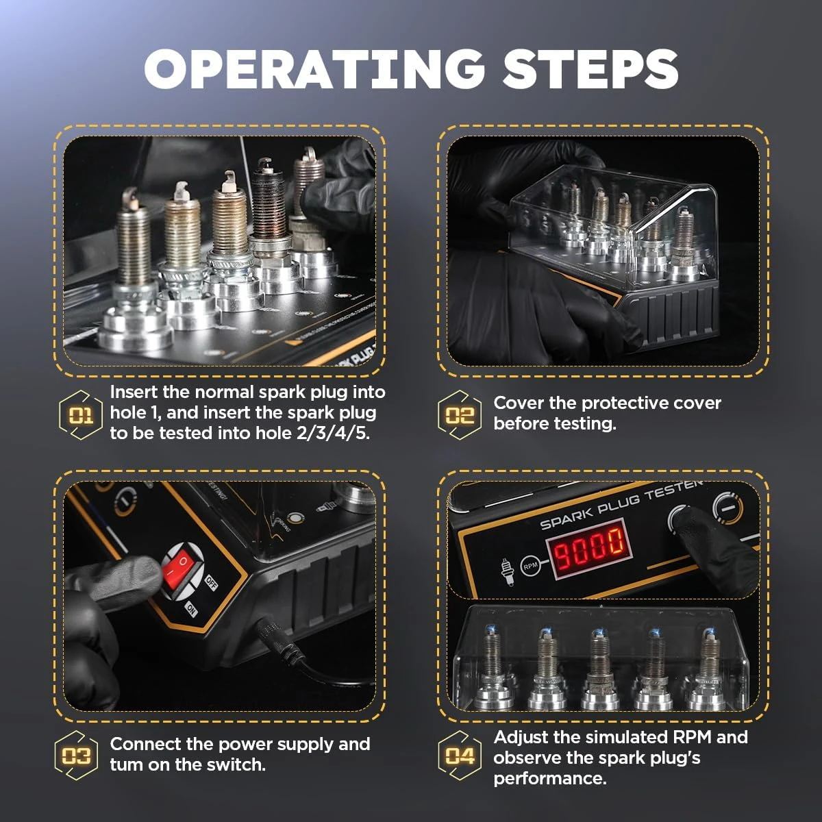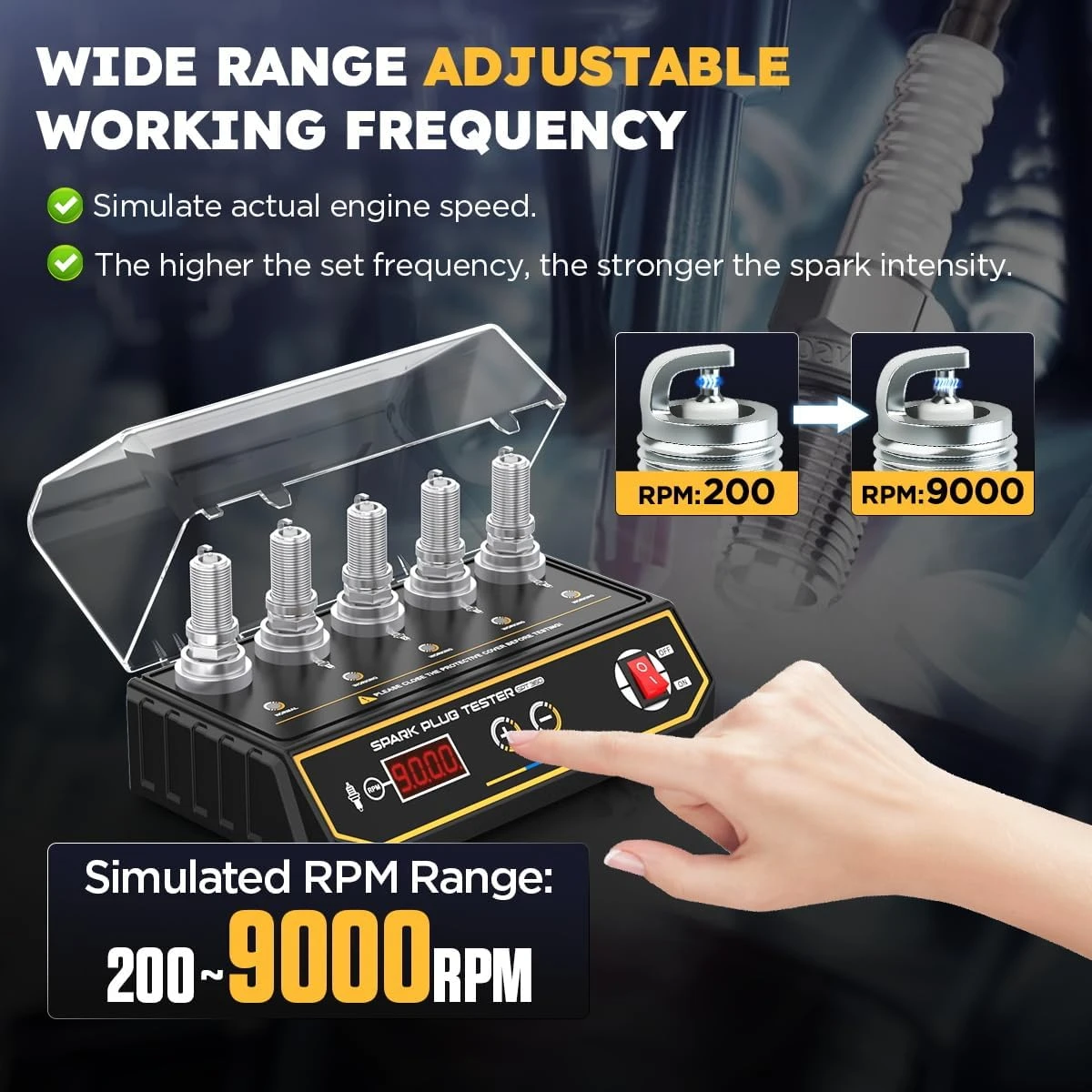 سهولة الاستخدام: أدخل الشمعة في الفتحة المطلوبة، أغلق الغطاء، وصّل كابل التغذية، ثم اضغط الزر لتشغيل الجهاز. يمكنك ضبط التردد يدويًا عبر الأزرار العلوية لمحاكاة الظروف الحقيقية لعمل المحرك.