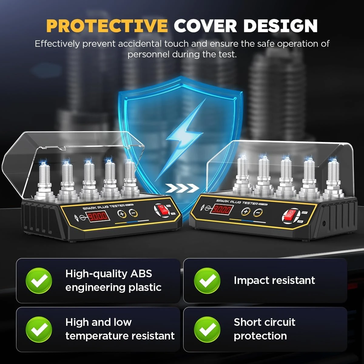 5 فتحات قابلة للاختبار معًا: اختبار 5 شمعات إشعال بشكل متزامن، مما يزيد من سرعة التشخيص والكشف عن الشمعة الضعيفة فورًا، مع إمكانية مقارنة قوة الشرارة ودرجة الاحتراق بين الشمعات الجديدة والمستعملة وتحديد مدى تآكل شمعة الإشعال من لون الشرارة.