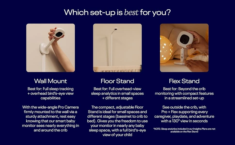 ما داخل العبوة: جهاز Nanit Pro لمراقبة الطفل مع تطبيق مرافق؛ حامل مرن محمول؛ حزام تنفس صغير بدون مجسات (0-3 أشهر).